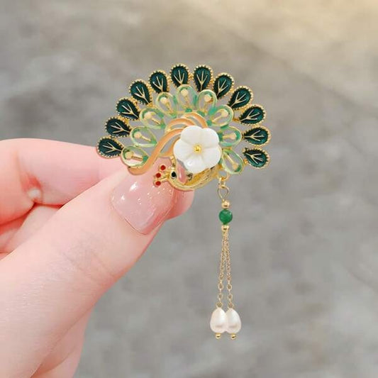 Glamorous Peacock Pearl Tassel Pin Brooch