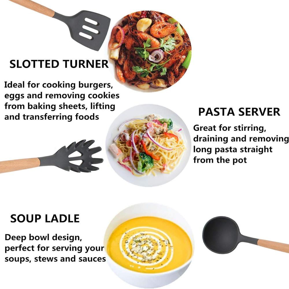 - 12 PCS silicone cooking utensil set covers various of kitchen needs for cooking.