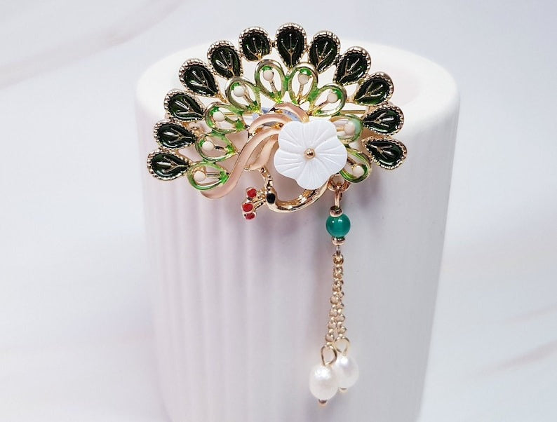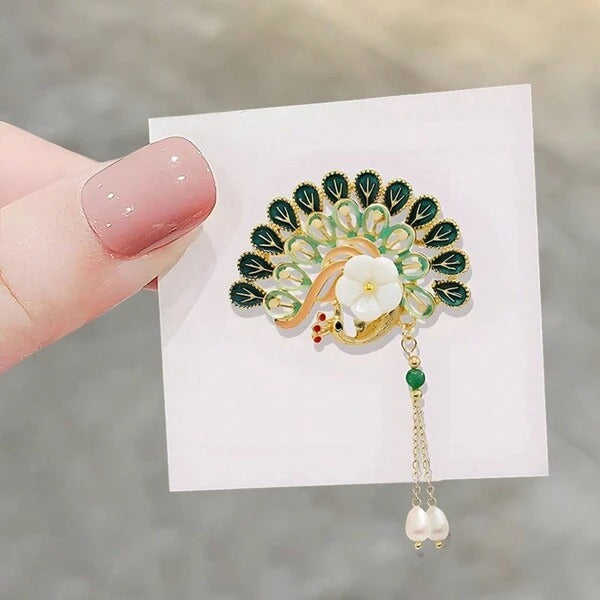 Indulge in the regal allure of the Glamorous Peacock Pearl Tassel Pin Brooch, an exquisite accessory that embodies the lavish elegance of a peacock's vibrant plumage. This opulent brooch features lustrous peacock pearls intricately arranged alongside delicate tassels, reminiscent of the majestic feathers of a peacock's tail. The meticulous craftsmanship and iridescent shimmer of the pearls evoke an aura of sophistication and luxury. Whether adorning lapels, shawls, or evening gowns, this brooch adds a touch of ornate glamour, elevating your ensemble with its captivating allure.