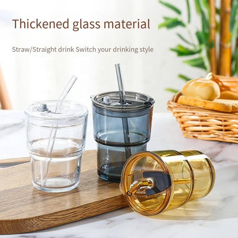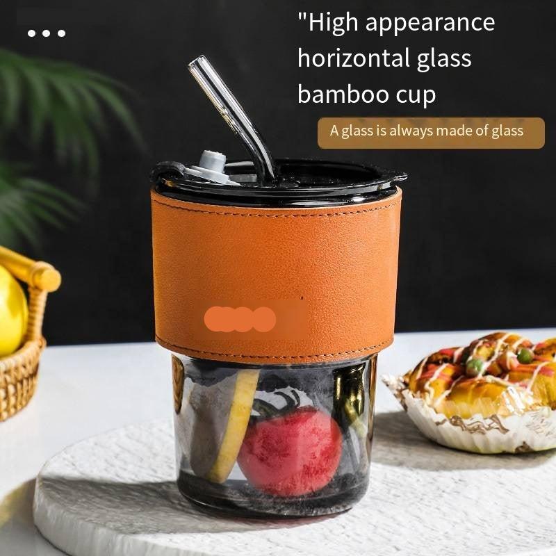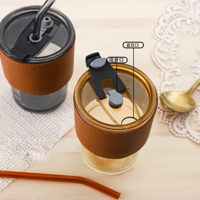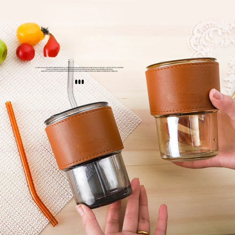 Leather Cover Glass Cup with Lid and Straw: Sip in Style and Comfort